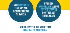 Začnu příkladem mladého Slováka Filipa Santy (19 let), který tři roky snil o tom, že se dostane do Silicon Valley, mekky technologických firem, jelikož miluje webový design. Aby nezůstal jen u pasivního snění, vytvořil web takemetosiliconvalley.com, kde tuto myšlenku prezentoval a hlavně představil svoji práci. Web se snažil rozšířit přes sociální sítě, a jelikož byla jeho myšlenka zajímavá, dostala se i do velkých médií a také do vysněného Silicon Valley. Filip během pouhých pár dní začal opravdu dostávat nabídky – nejdříve od start-upů, později i od takových firem, jako je Twitter nebo PayPal. V srpnu 2012 pak Filip začal pracovat v USA ve společnosti Nitro, kterou si on vybral z dlouhé řady zájemců. V podstatě svým krokem obrátil klasický poměr uchazečů na pozici ve svůj prospěch. Jak se mu daří si můžete přečíst v jeho blogu. Podobnou českou kampaň šikovného studenta najdete na jobinsiliconvalley.com.